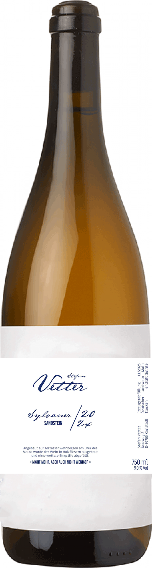 Stefan Vetter geht es darum, diese besondere Herkunft in seinen Weinen so unverfälscht wie möglich zum Ausdruck zu bringen. Dazu hat er eine präzise Vorstellung der Traubenreife im Kopf und verzichtet im Keller radikal auf jedweden geschmacks- oder stilverändernden Aktionismus. Keine Zusatzstoffe, keine Auf-, keine Entsäuerung, keine Schönung, keine Filtration, nur minimale Schwefelung, dafür viel Zeit im Holzfaß auf der Hefe. Seine Vorstellung von Naturwein, die sich mit unserer deckt. Franken mal ungeschminkt klischeefrei.